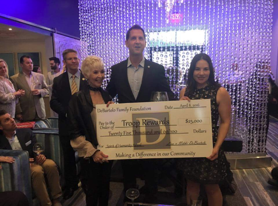 Troop Rewards selected as the DeBartolo Family Foundation’s “Spirit of Humanity” award for 2016. Candy and Lisa DeBartolo presented the $25,000 check and the beautiful “Spirit of Humanity” Award to our founder, Tom Burkett, at Candy DeBartolo’s new premier restaurant called the Sacred Pepper at the family and friends night. Mrs.Gen. H. Norman Schwarzkopf and her daughter, Jessica Schwarzkopf were there to share the moment along with some Troop Rewards Board Members, Vance Vogel and CMSgt Scott Blake.